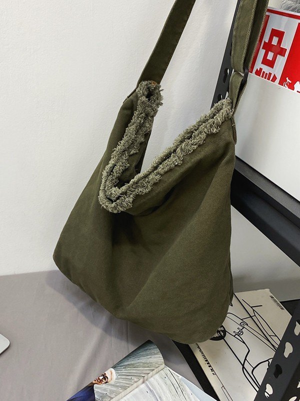 Detalles : Tiene un ribete deshilachado sin rematar, con bandolera ajustable, bolsillos interiores y diseño de cierre con cremallera metálica.