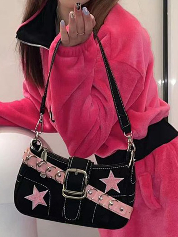 Detalles: Estos bolsos de hombro para niñas tienen una correa de hombro desmontable y metálica diseño de cadena, cuenta con un parche de estrella, paneles con cinturón con anilla en D en la parte delantera, tiene un detalle de costura en contraste y un diseño de cierre de correa con hebilla.