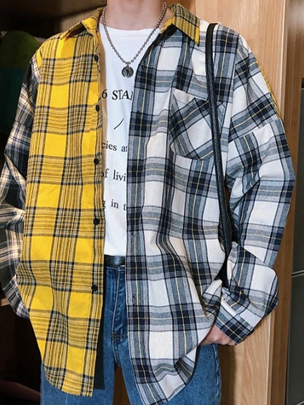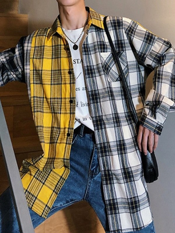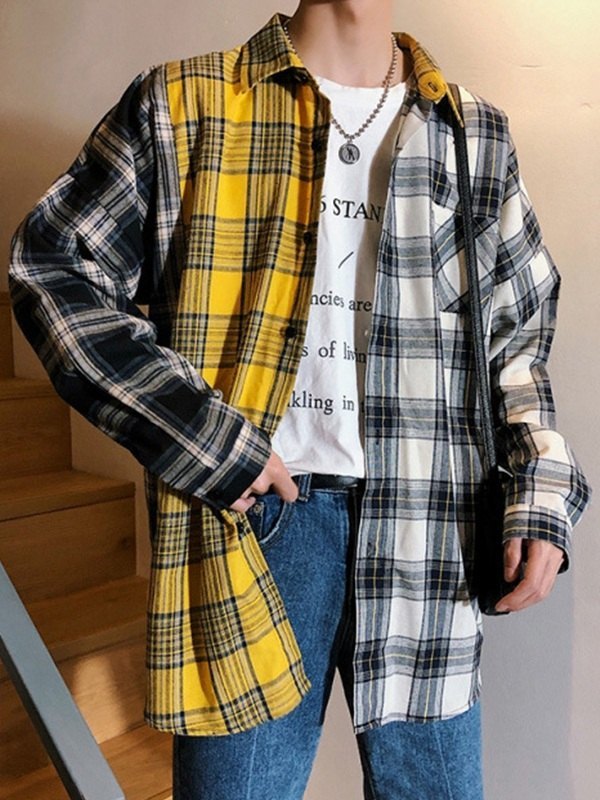 Descripción: Estas acogedoras camisas para hombre de estilo preppy cortadas con una silueta relajada, confeccionadas con tela de mezcla de algodón, cuentan con un estampado de patrón a cuadros de patchwork, un bolsillo delantero y un diseño de hombros caídos, y terminan con un diseño de cierre de botones.