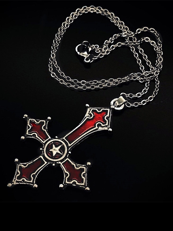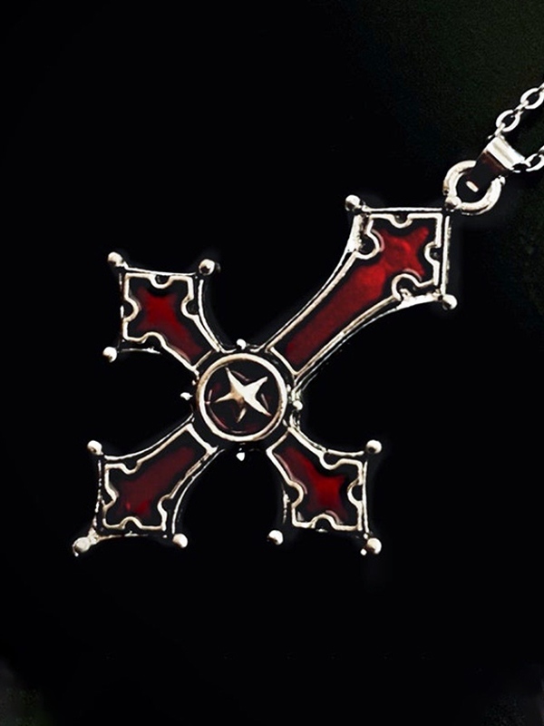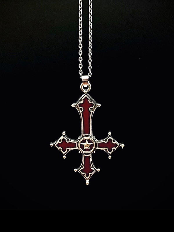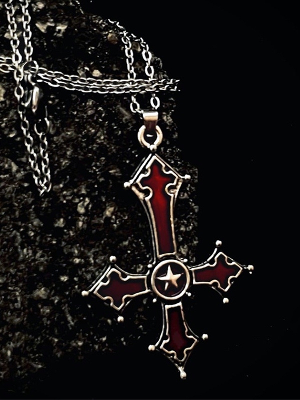 Collar con colgante de cruz invertida rojo sangre